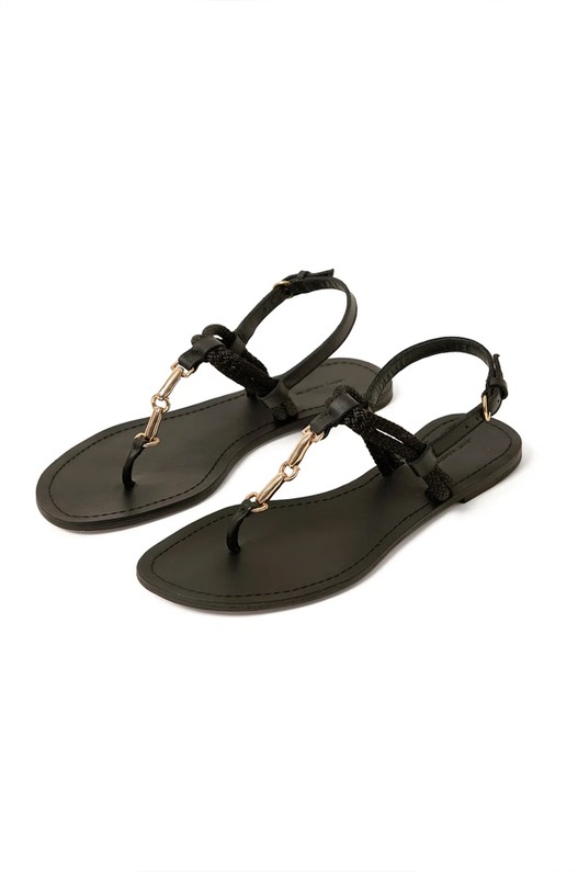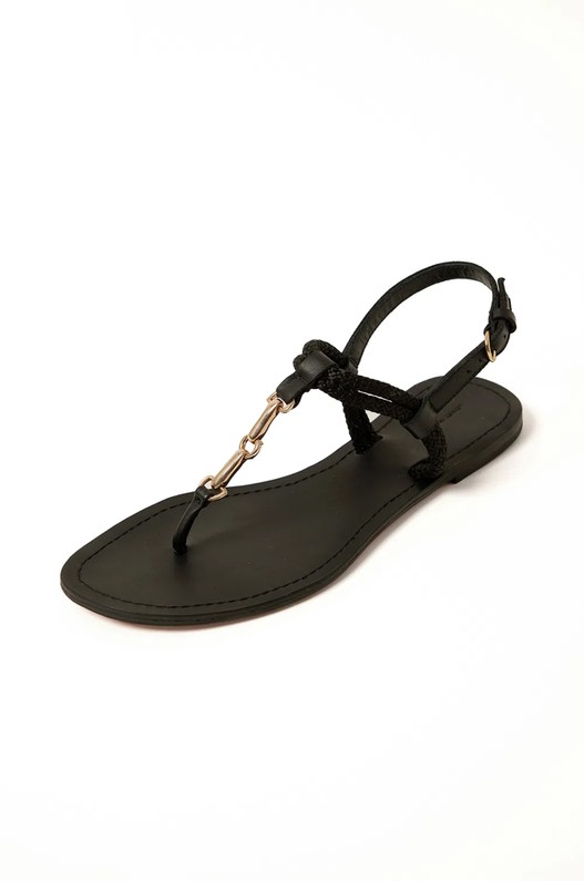 Sandália preta, com detalhe em corda e bridão em metal dourado. Possui fivela de metal, que facilita o ajuste. A sandália preta com detalhe dourado é versátil e traz sofisticação para as produções.