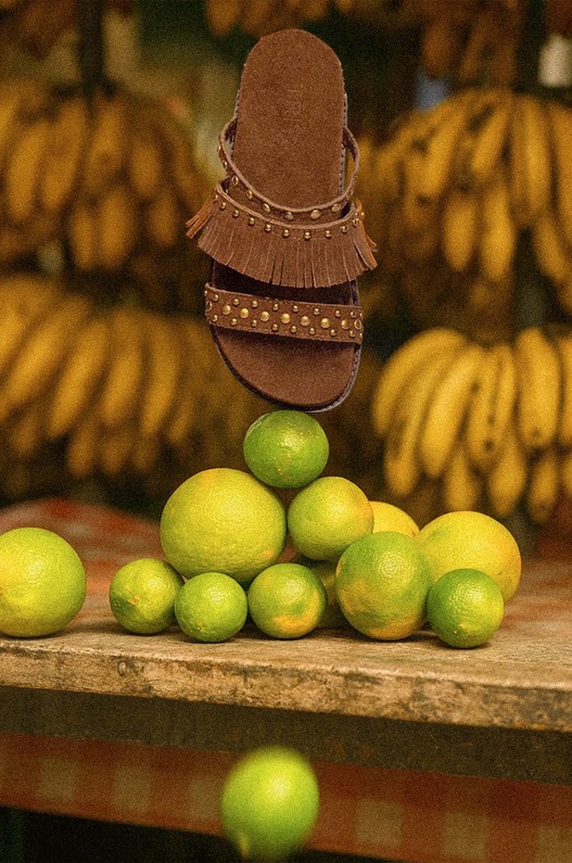Sandália rasteira de camurção com tiras na frente e franja e detalhes em ouro velho.