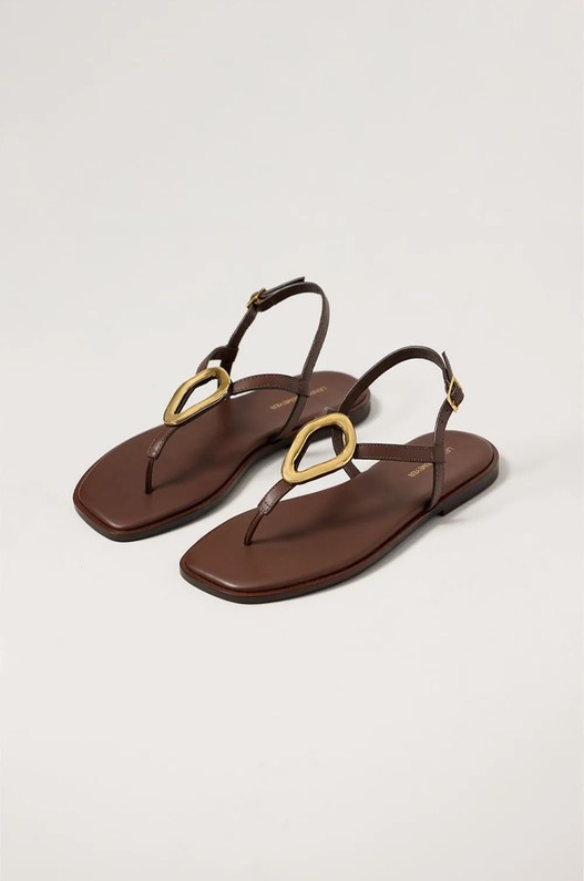 Sandália de couro com detalhe de metal orgânico, palmilha amalfi com vira e fechamento com fivela. Prático e sofisticado, deixa o look elegante e se adapta facilmente a situações de dia ou noite.
