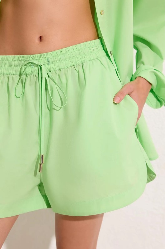 • Cós com elástico e rolotê para amarração, além de bolsos laterais funcionais.