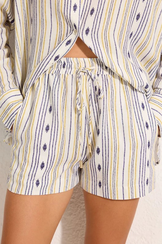 ESTAMPA WALLY: Combina listras finas em azul e amarelo com pequenos detalhes bordados, criando efeito rítmico sobre fundo claro, que avoca estilo artesanal em contraponto com sua versão de fundo marinho.