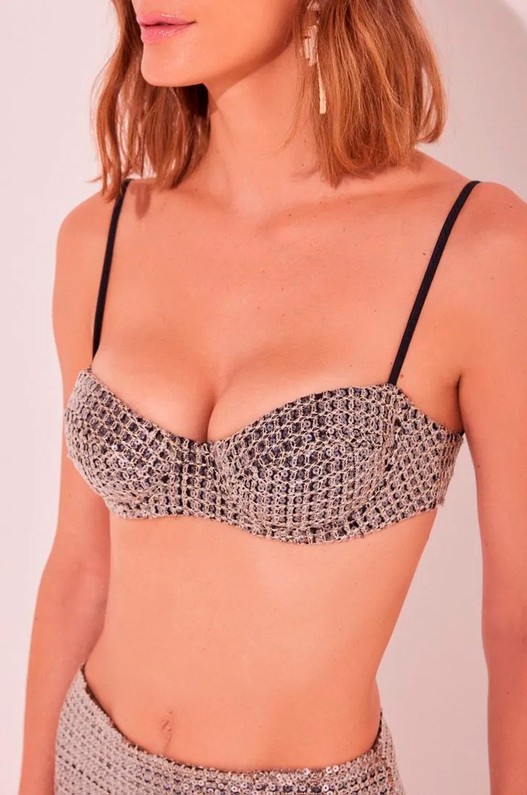 Confeccionado em Tricô Paetê, ele combina elegância e conforto. Com bojo removível e arco no busto, oferece excelente sustentação e ajuste. As alças fixas e o fechamento com gancho nas costas garantem praticidade e segurança, enquanto os detalhes em zig-zag nos viéses adicionam um acabamento contemporâneo ao design.