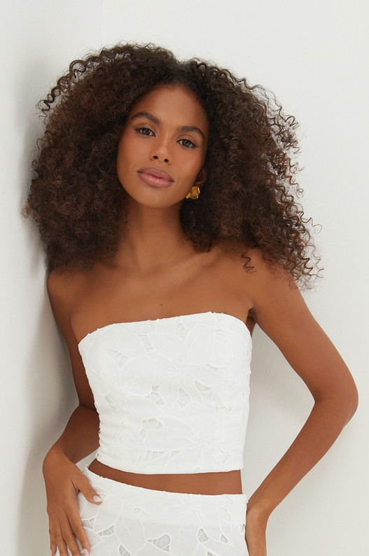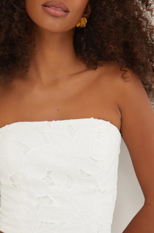 O top branco Mei é uma peça versátil que pode ser usada com shorts, calças ou saias da coleção. Uma exclusividade do ateliê ViX, a laise maxi equilibra flores e delicados cut-outs entre as pétalas em 100% algodão. Experimente usá-lo com sandálias, bolsas e outros acessórios ViX.