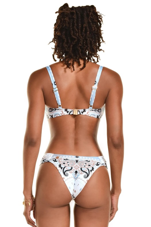 Biquíni com proteção UV 50+ microfibra estampa digital floral exclusiva Verão 2026. top meia-taça possui aro estruturado que valoriza o colo, alças com regulador e fecho nas costas em banho dourado.