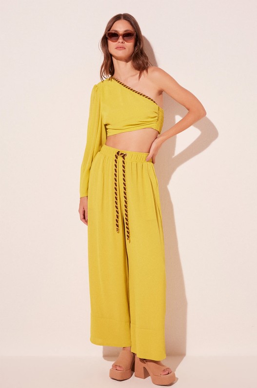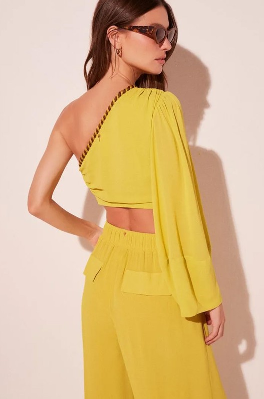 Transforme seu guarda-roupa com o top Ombro Só Franzido Citrus Amarelo, uma peça audaciosa e elegante. Fabricado em Visco Georgette, este top assimétrico se destaca com seu design de um ombro só, franzido para criar uma textura rica e atraente. Um zíper lateral destacável oferece facilidade de uso, enquanto um cordão torcido ao longo do decote adiciona um toque sofisticado e detalhado. Ideal para ser combinado com a calça reta cós de elástico na mesma tonalidade, este top é perfeito para eventos especiais ou um encontro casual chic.