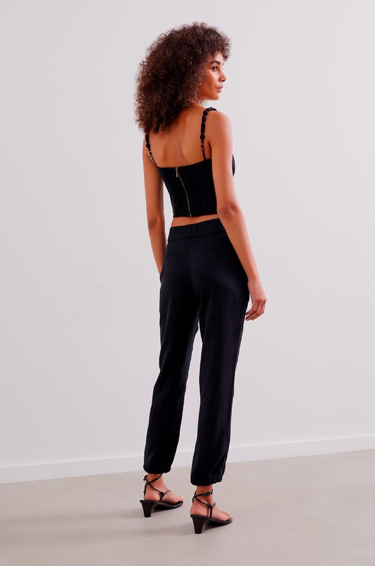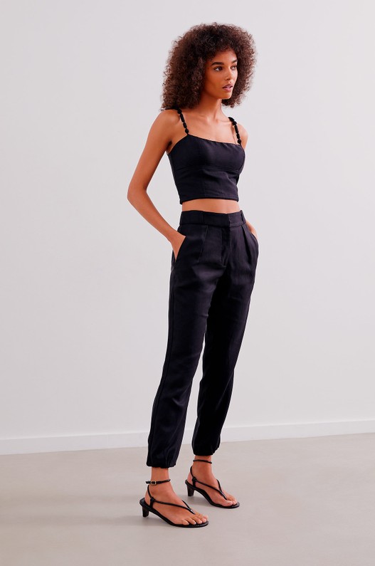 Top ajustado com recorte no busto, zíper e lastex. Nas alças, uma nova versão de Beads como detalhe. São cilindros e esferas revestidas de tecido, mesma proposta dos novos biquínis Atena. Get the look: uma peça sofisticada e curinga para compor diversas produções.