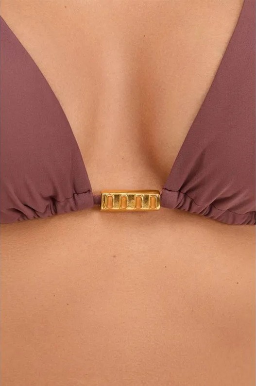 A modelagem Tri tem o top de biquíni roxo em shape triângulo ajustável com amarração nas costas e no pescoço.