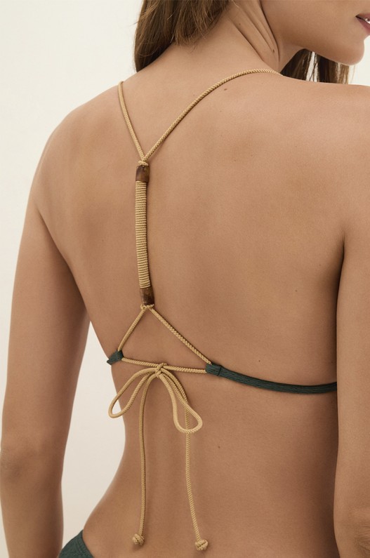 A modelagem Tri Costas tem o top de biquíni verde em shape triângulo ajustável e amarração + detalhe vertical na parte de trás, dando um efeito alongado.