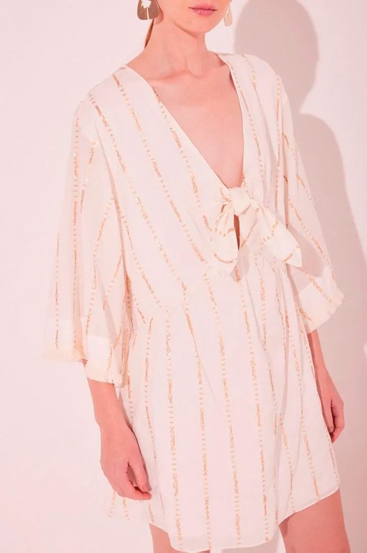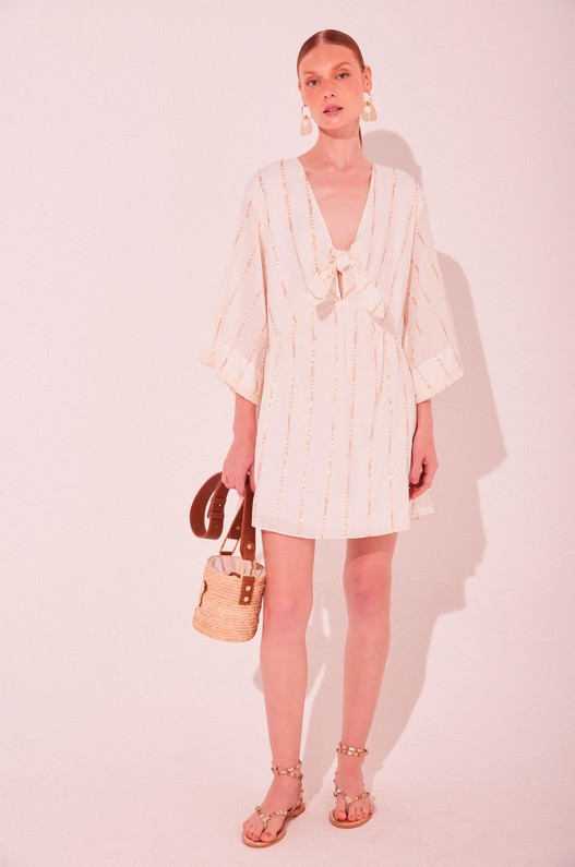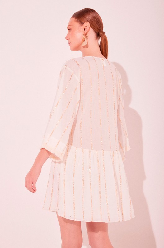 O Vestido Curto Manga Quadrada do mix Leveza Off White, feito em algodão com bordado dourado, é a expressão perfeita de charme e sofisticação.