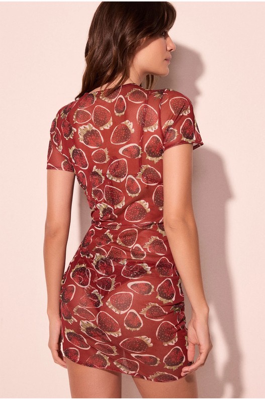 O Vestido Curto Morangos, confeccionado em tule, exibe a colagem de morangos sobre fundo vermelho intenso. Com comprimento curto, decote em V profundo e mangas curtas, o modelo possui canal central com rolotê para ajuste, trazendo movimento e frescor à peça.