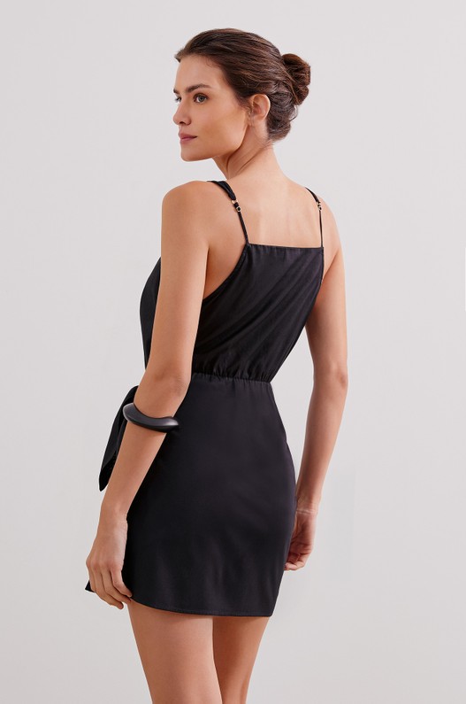 Vestido curto com alças paralelas e detalhe de acessório em metal. Decote em “V” transpassado que vai até a cintura marcada por recorte. Saia sobreposta com amarração lateral, estilo pareô. Uma modelagem pensada para valorizar pontos-chave da silhueta. Proposta despretensiosa equilibrada com atemporalidade e sofisticação. Aposte em salto + bolsa pequena para uma produção mais especial.