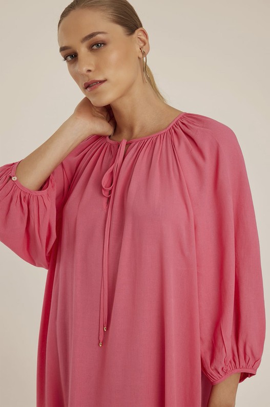 Vestido midi em cambraia de linho com viscose, com modelagem ampla, franzido no decote e manga com franzido no punho tipo bata. O vestido com decote franzido é uma peça versátil, que pode ser usada como saída de praia ou para o dia a dia. Aposte em uma composição com acessórios da coleção para um look sofisticado.