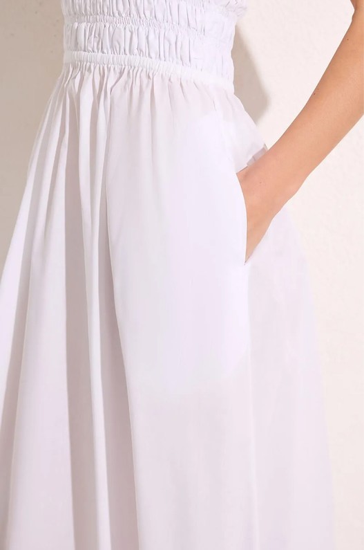 Vestido Lastex Alça Removível • Vestido midi em tricoline de algodão, com busto em lastex e decote reto. • Alças removíveis e saia franzida com bolsos laterais. • Modelagem fluida e feminina, ideal para dias ensolarados e produções leves.