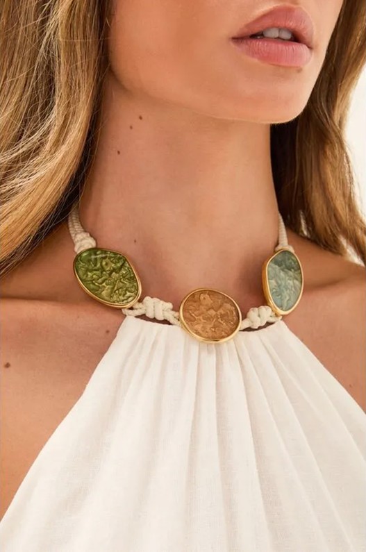 Frente única com amarração no pescoço - combinado com trio de resinas coloridas de formatos diferentes e detalhes em nó com corda elástica na cor