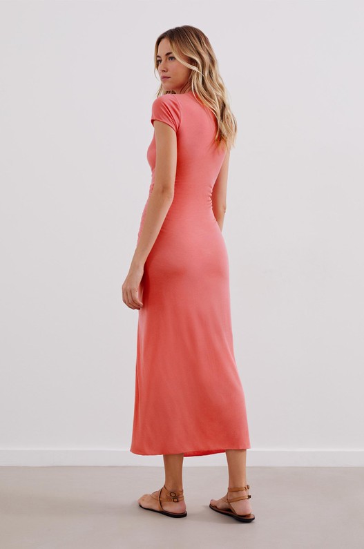 Vestido de malha com decote arredondado, mangas curtas, recorte com franzidos na saia, fenda frontal. Get the look: pode ser usado em looks diurnos e casuais com flats ou em looks mais arrumados para a noite com sandálias altas e bijoux.