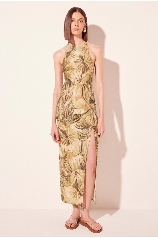 O Vestido Longo Copa Palmeiras, confeccionado em viscose lurex, apresenta comprimento longo e decote profundo nas costas, equilibrando sensualidade e leveza. O detalhe de elo na fenda e o botão no pescoço das costas trazem sofisticação e refinamento, enquanto a fenda frontal adiciona movimento e fluidez. A estampa de folhagens verdes sobre o fundo off white ilumina a peça com naturalidade e elegância.