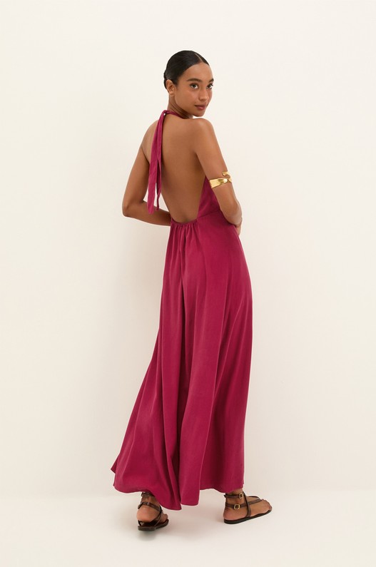 O vestido longo rosa Joy traduz leveza e frescor em cada detalhe. O metal dourado na gola simula um colar delicado que envolve o pescoço, realçado pelo decote em V e amarração no pescoço. A saia solta, com fenda frontal, acompanha o movimento com naturalidade e é ideal para compor diferentes produções. Para transitar do dia para a noite, aposte em acessórios ViX Paula Hermanny.
