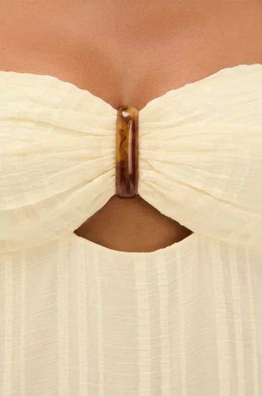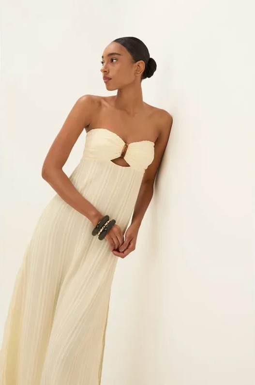Fresh e fluido, o vestido longo off white Loly, em algodão listrado, apresenta modelagem sem alça com decote arredondado e leve cut-out abaixo do busto. A saia solta adiciona leveza, enquanto o detalhe de resina colorida no busto confere um toque sofisticado ao visual.
