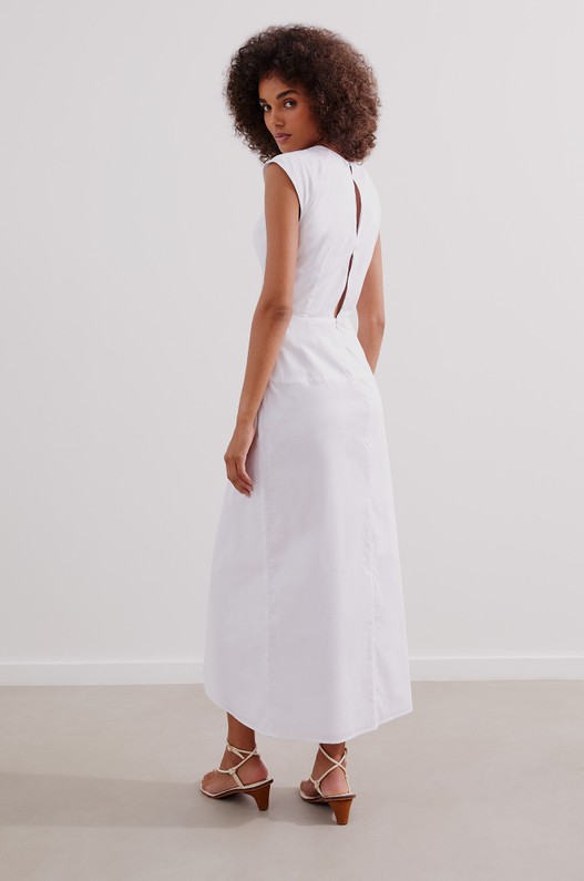 Vestido de algodão com decote em gota, leves franzidos no busto e na saia, cut-out na cintura, fenda frontal, abotoamento nas costas, zíper e forro. Get the look: pode ser usado em looks diurnos e casuais com flats, ou em looks mais arrumados com sandálias mais altas, botas e bijoux.
