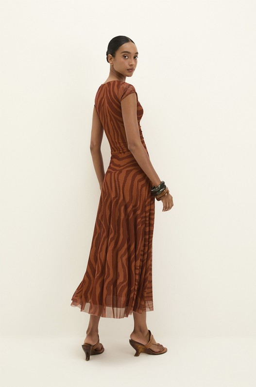 O vestido midi de tule estampado Susan tem a blusa franzida e mangas curtas que trazem movimento ao look. A saia levemente ampla equilibra o shape que valoriza a silhueta, além de ser perfeita para levar na mala de viagem, já que o seu material seca rápido e não amassa. A peça possui forro de malha.