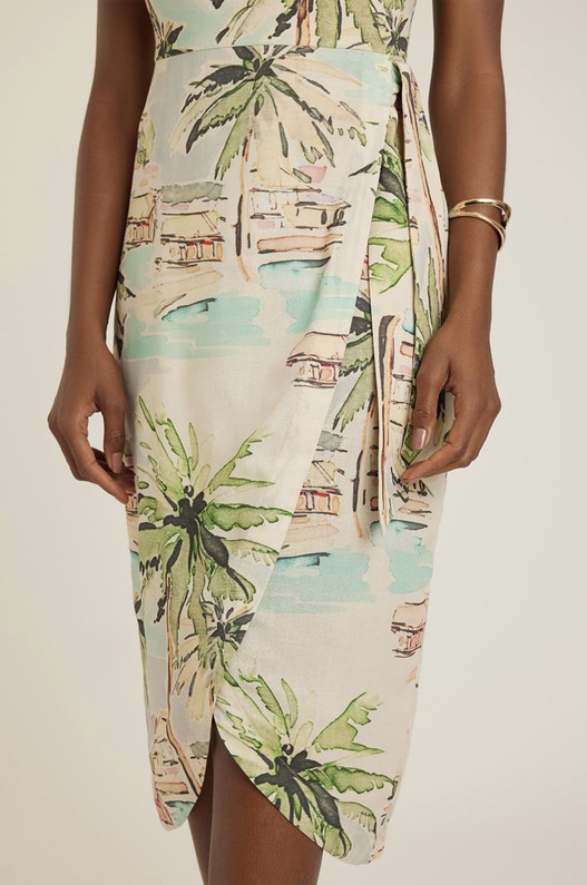 Itacaré: Uma reedição da estampa icônica do verão 2005, a Itacaré é uma paisagem praiana feita com aquarelado em fundo de linho natural.