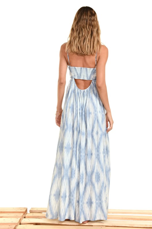 Vestido comprimento longo com detalhe no busto franzido com alça fina e regulador, costas detalhe lastex. Tecido estampa digital exclusiva.